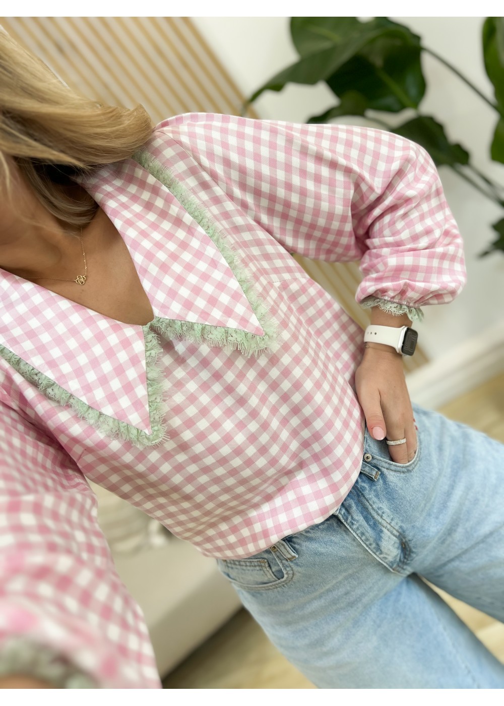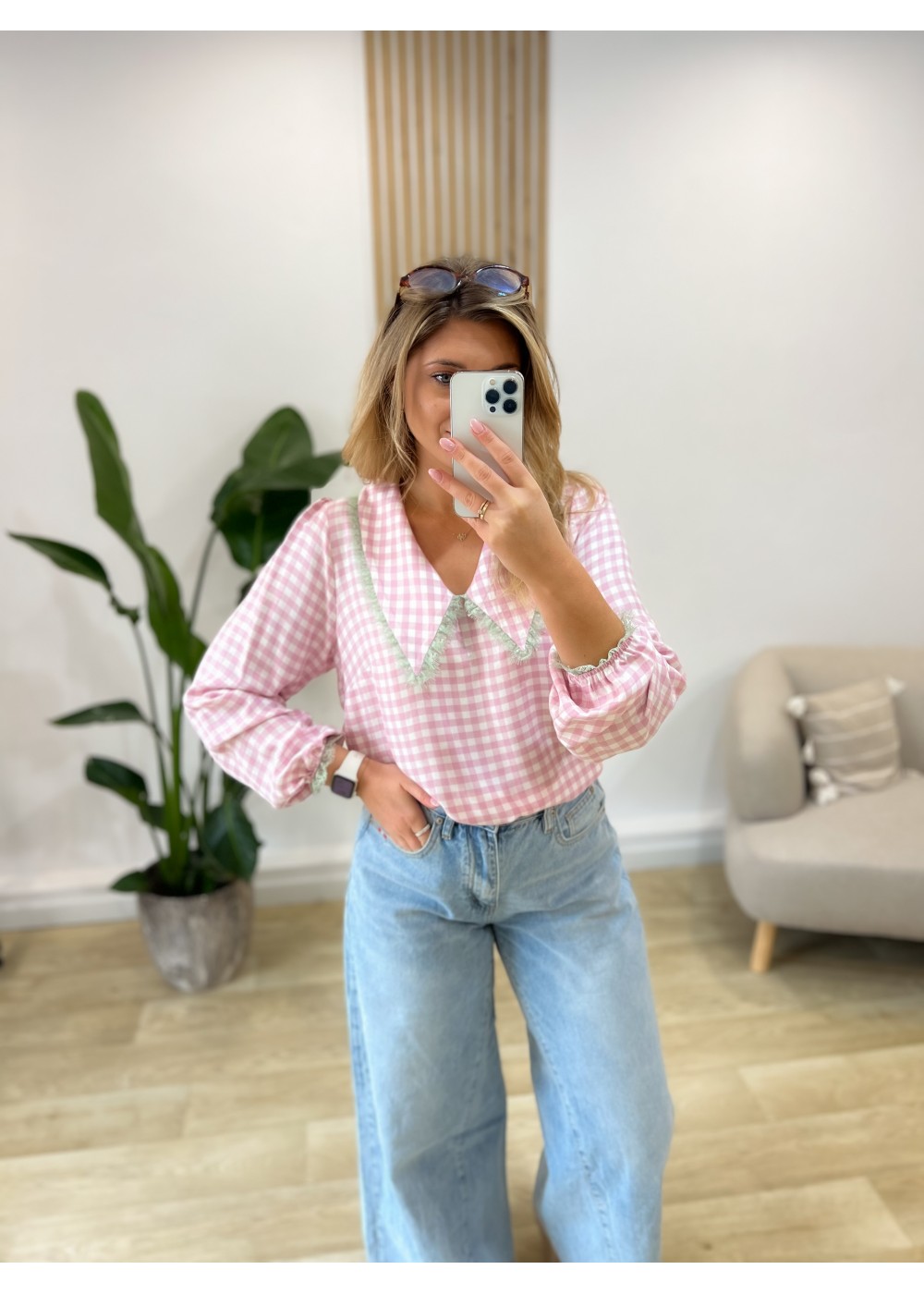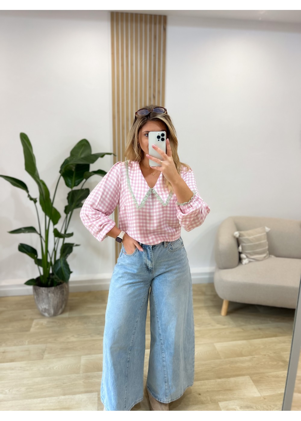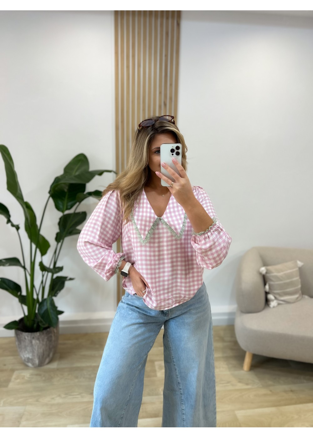 Koszula ma pięknie wykończony kołnierzyk zakończony koronkowym materiałem.