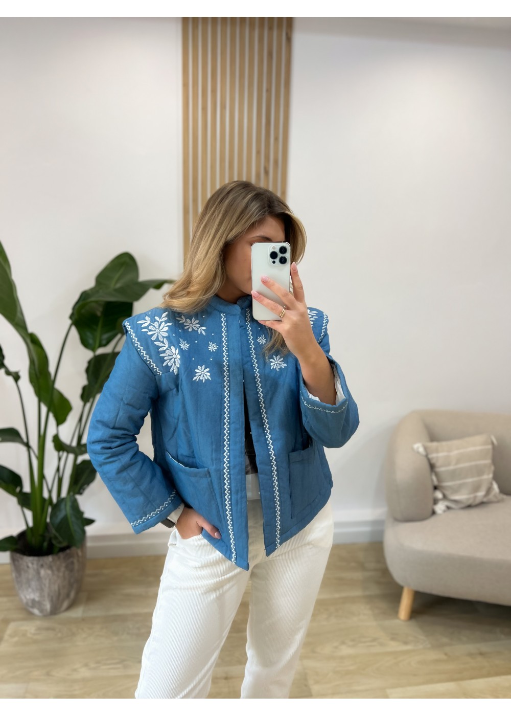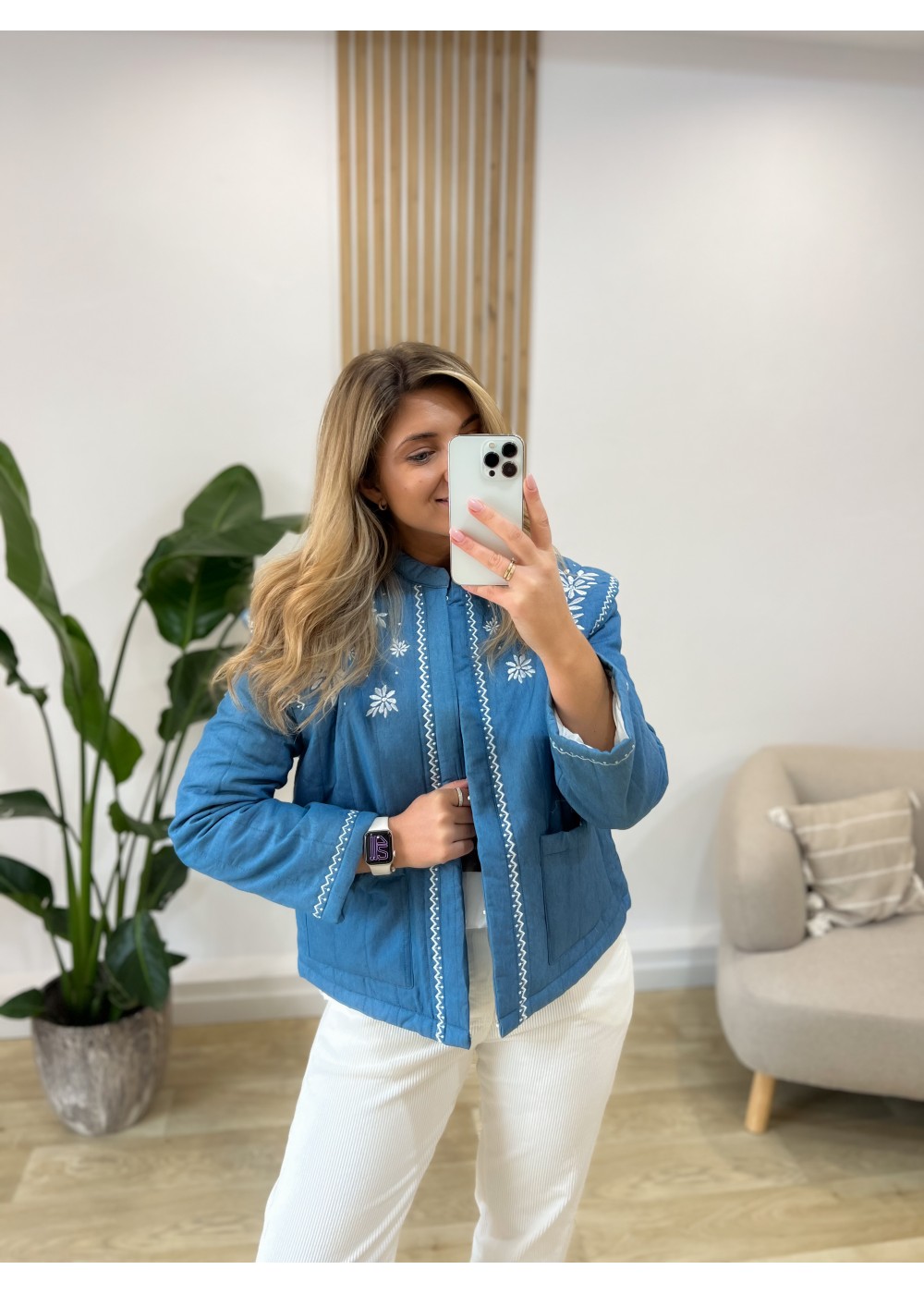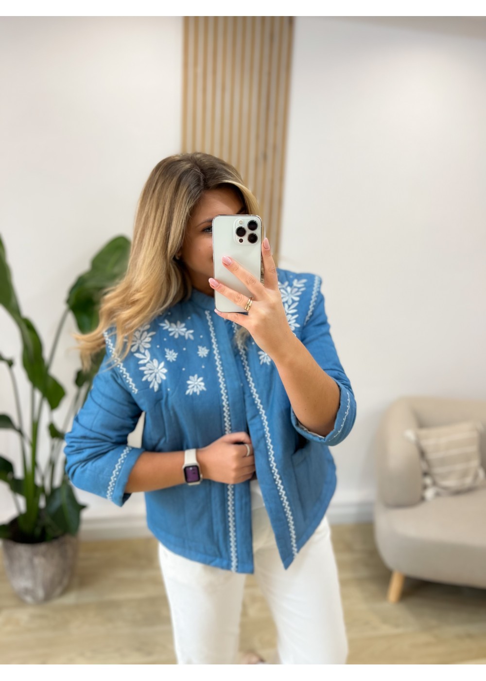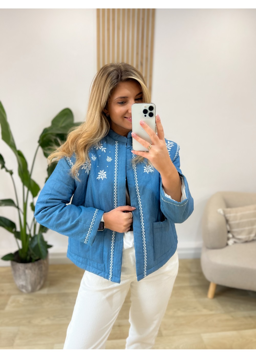 Kurtka w kolorze jeansu z pięknym białym haftem.