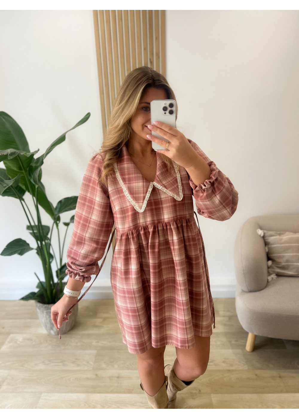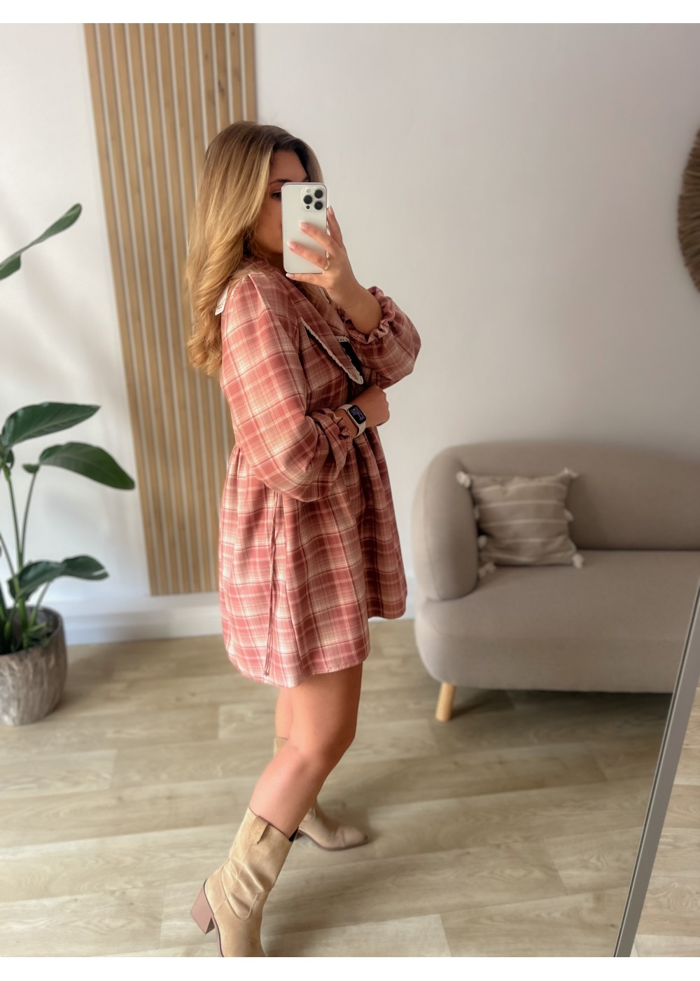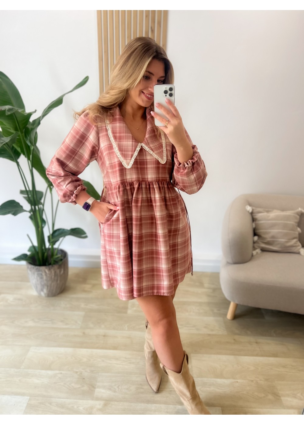 Sukienka posiada kieszenie i sznureczki do związania talii.