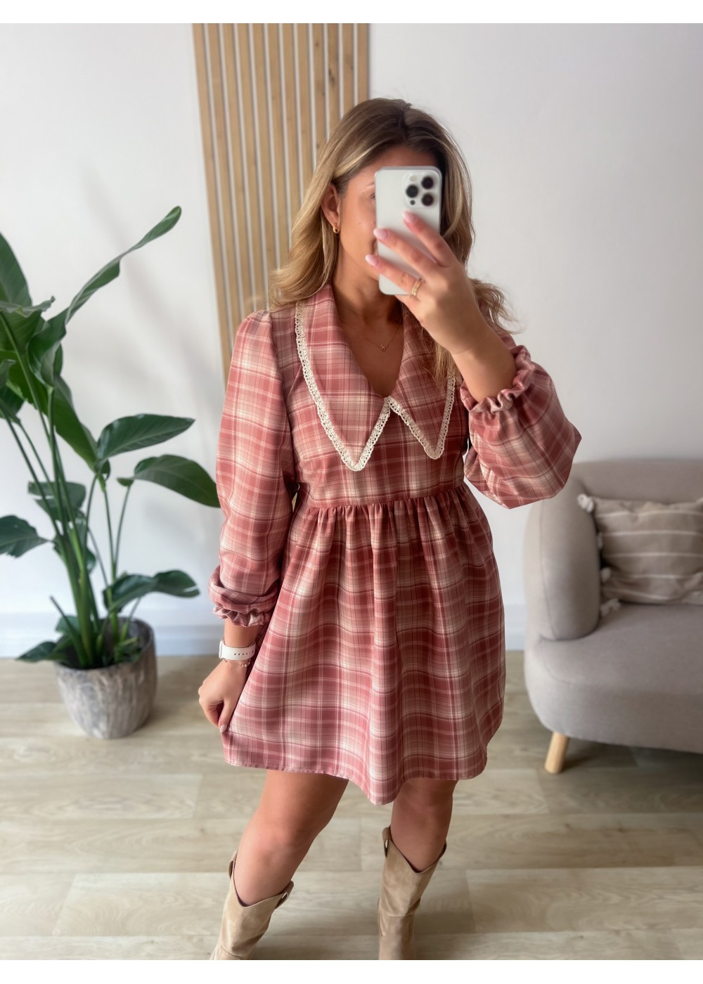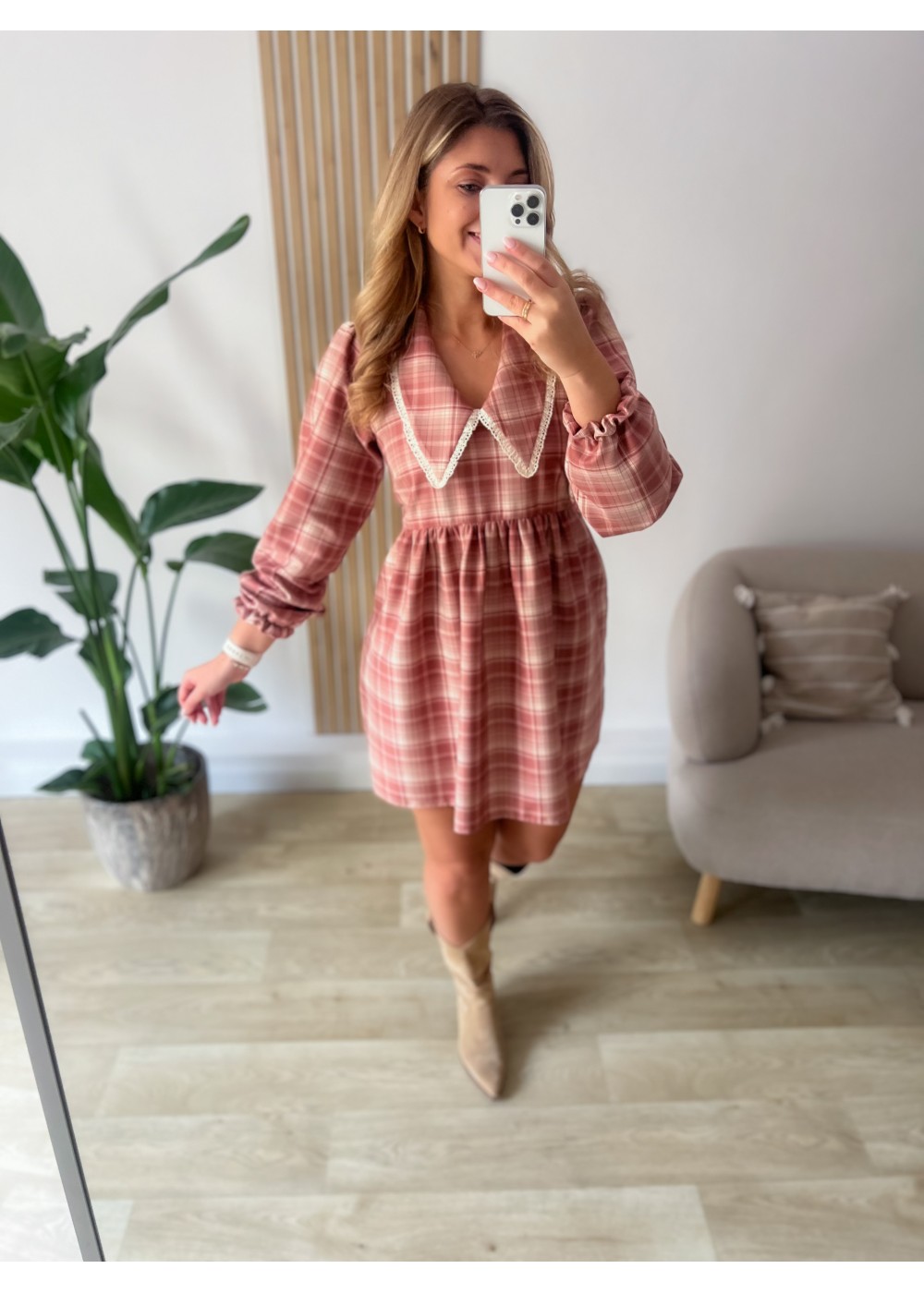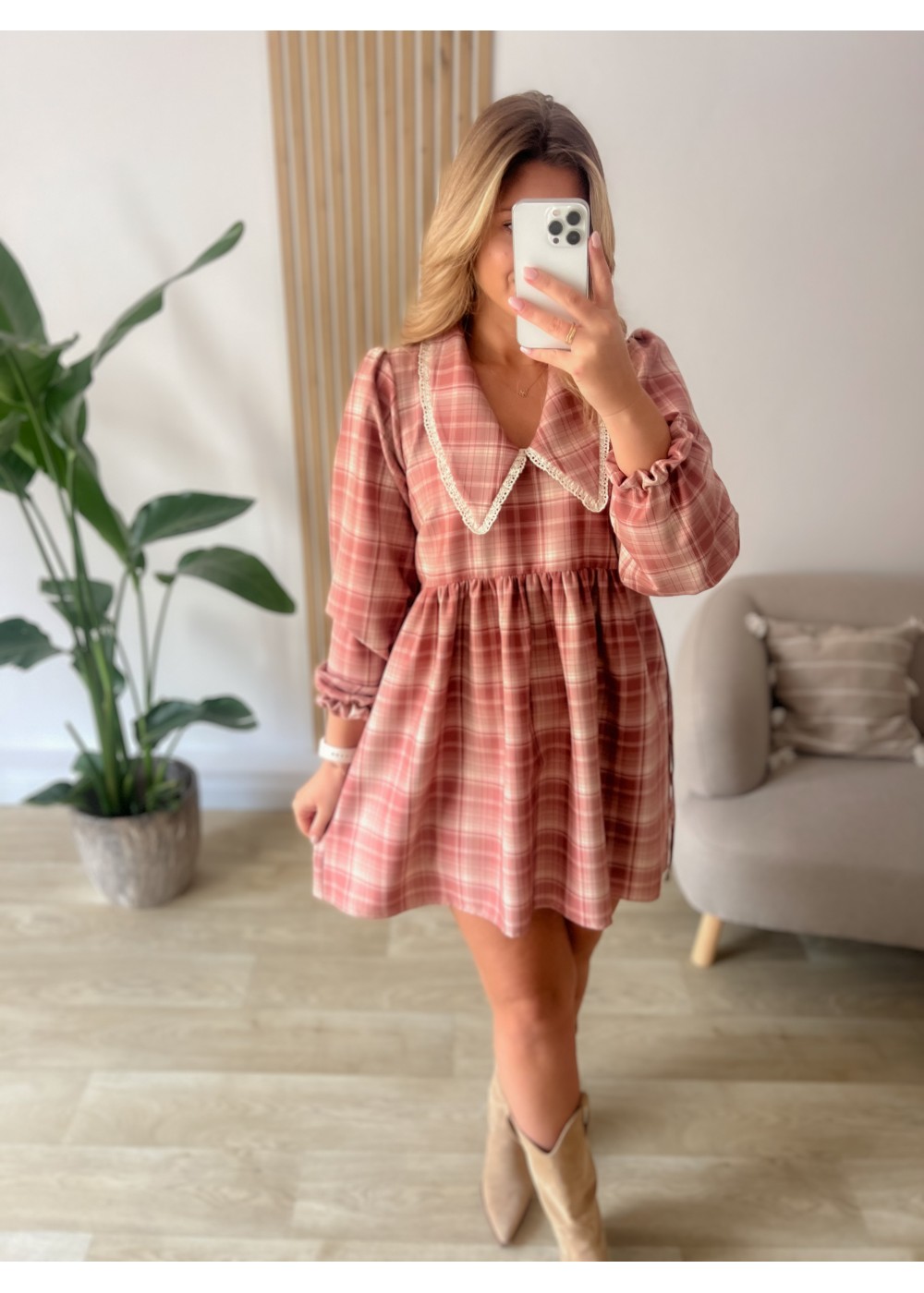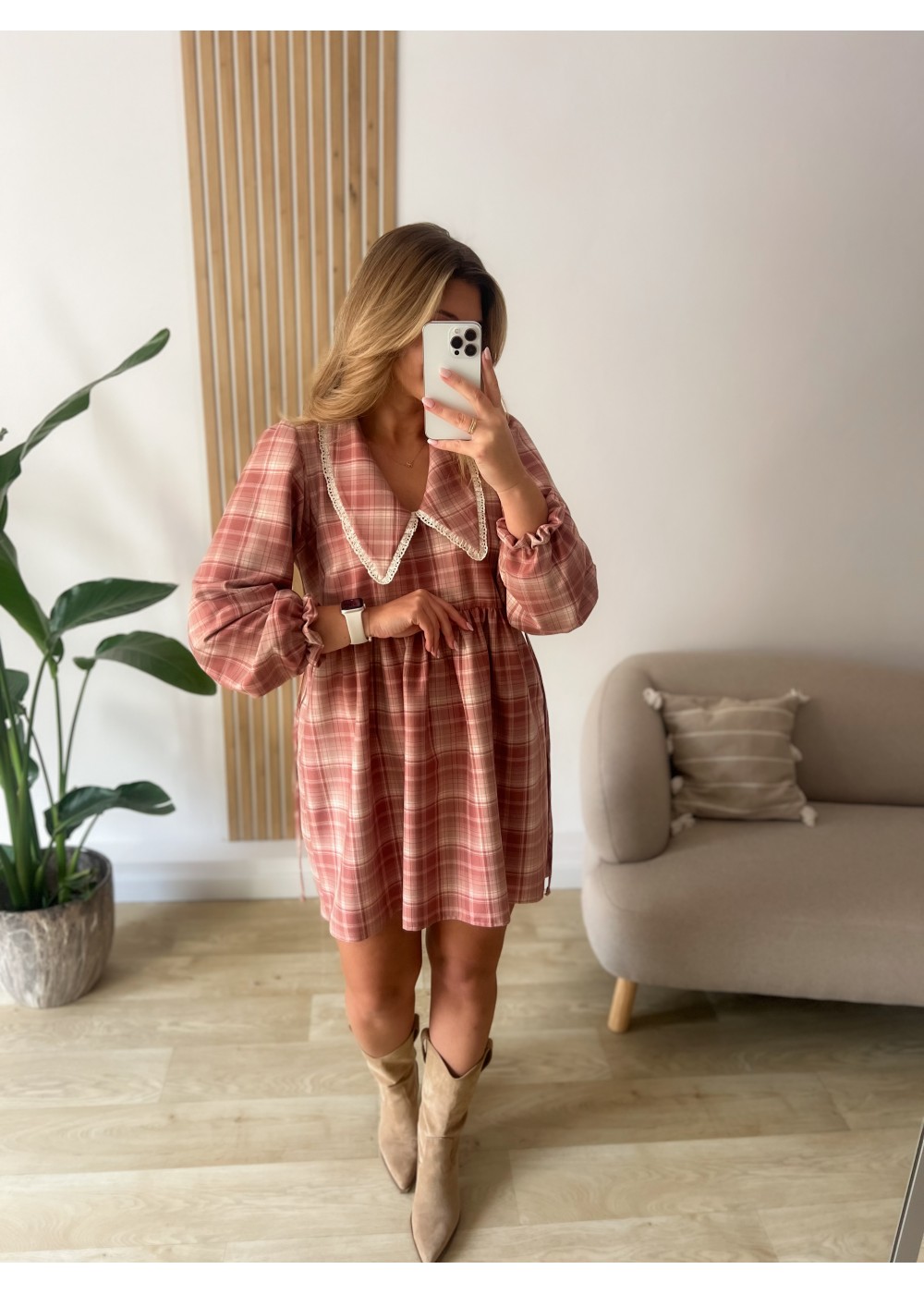 Sukienka posiada kieszenie i sznureczki do związania talii.